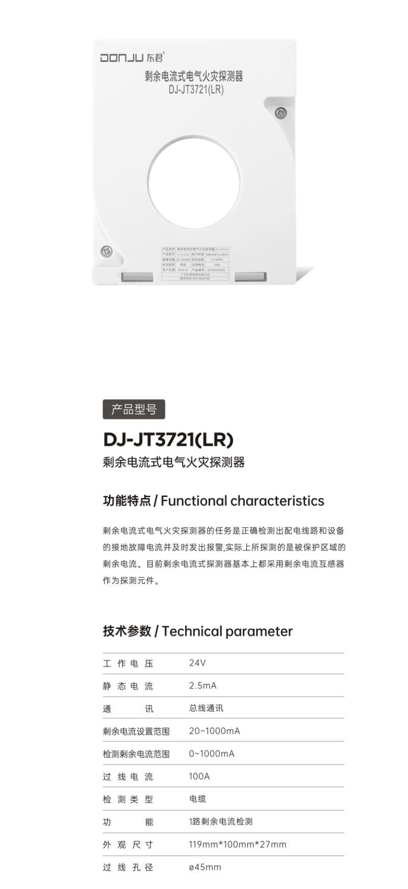 DJ-JT3721(LR)剩余电流式电气火灾探测器
